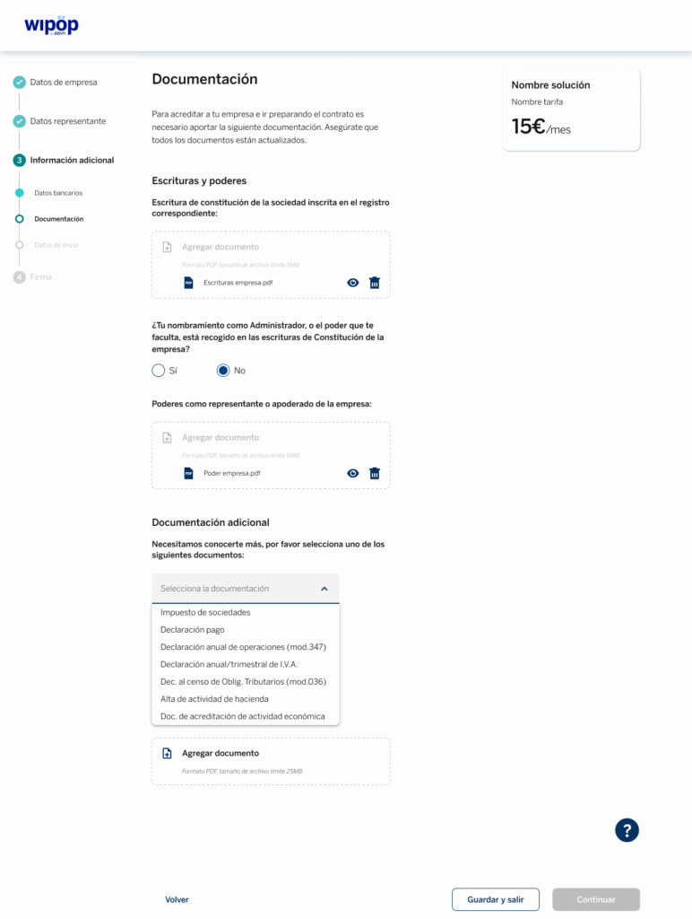 Al acceder a la segunda pestaña, te solicitaremos adjuntar las escrituras de constitución de la empresa, los poderes como representante de la empresa y, por seguridad, un documento adicional entre varios disponibles para elegir: