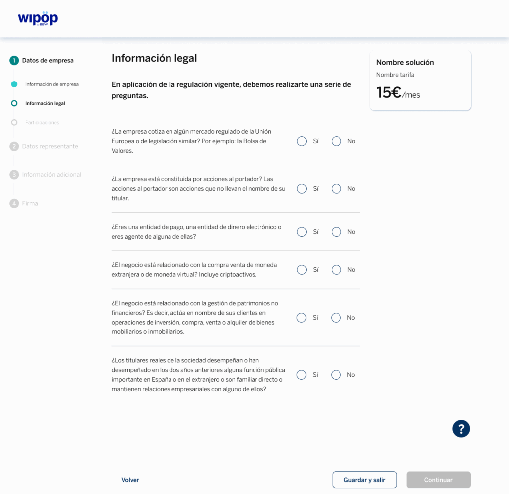 En la segunda pestaña de este paso, se te solicitará introducir tu información legal mediante este sencillo cuestionario: