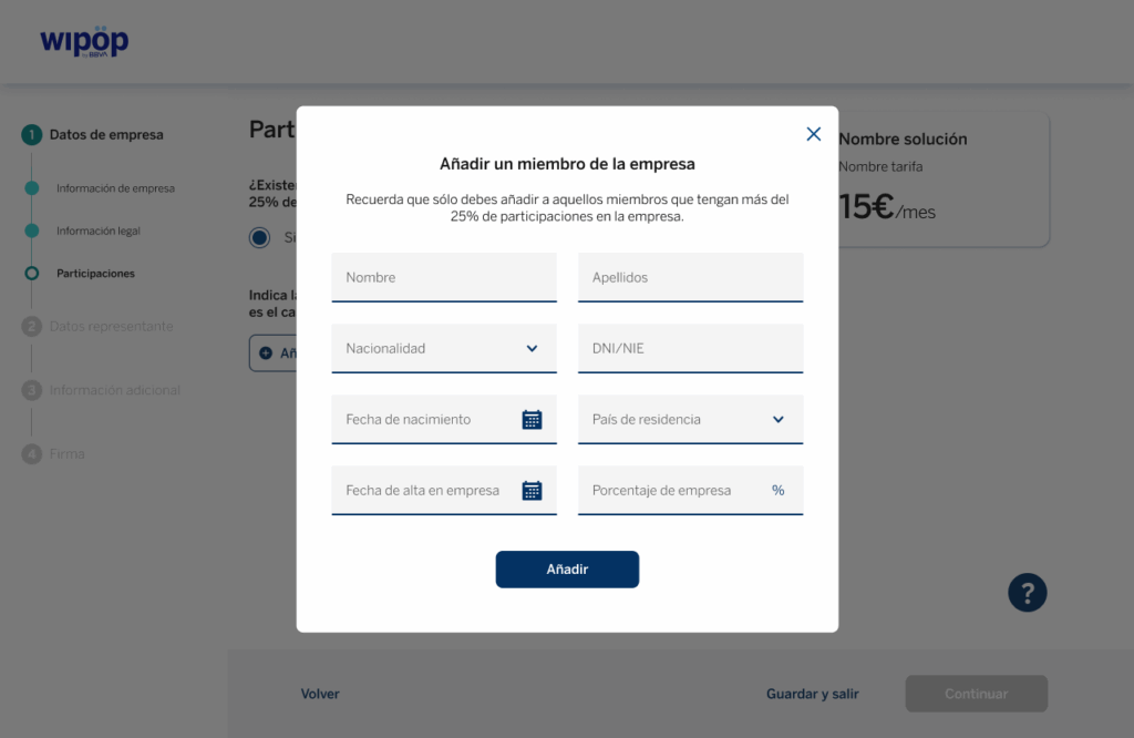 Por último, accederás a la tercera pestaña en la que deberás indicar si hay más participantes en tu negocio. Es decir, personas físicas que controlan o poseen más del 25 % de la empresa. En caso afirmativo, te pediremos añadir tantos miembros como sea necesario en tu empresa. Para ello, sólo tienes que introducir los datos que se muestran en este ejemplo: