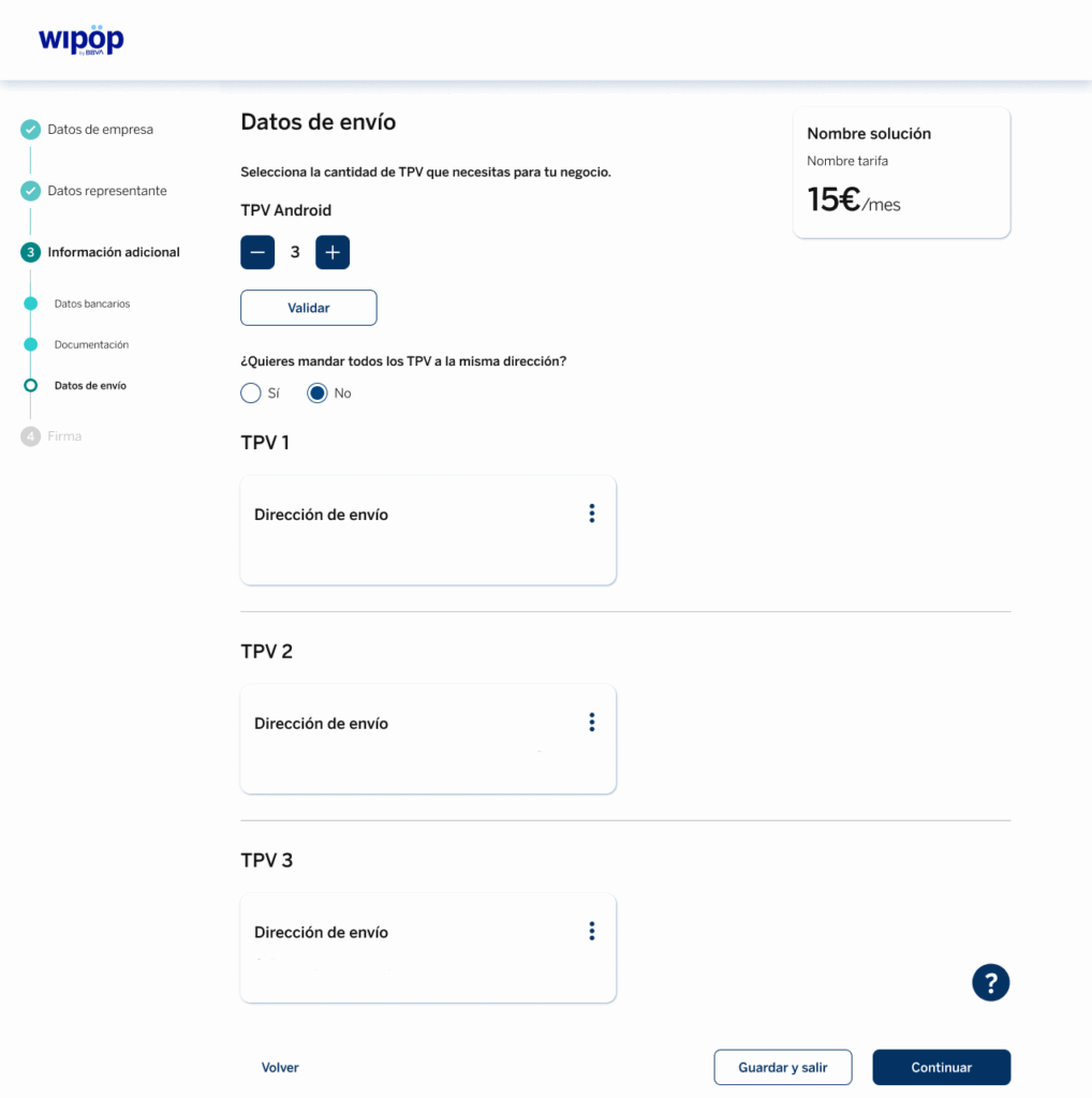 En caso de solicitar nuestro Wipöp TPV, accederás a una tercera pestaña en la que deberás introducir la información requerida para realizarte el envío del terminal. En caso de contratar varios TPV, tienes la posibilidad de enviarlos a diferentes direcciones, tal y como en el ejemplo: