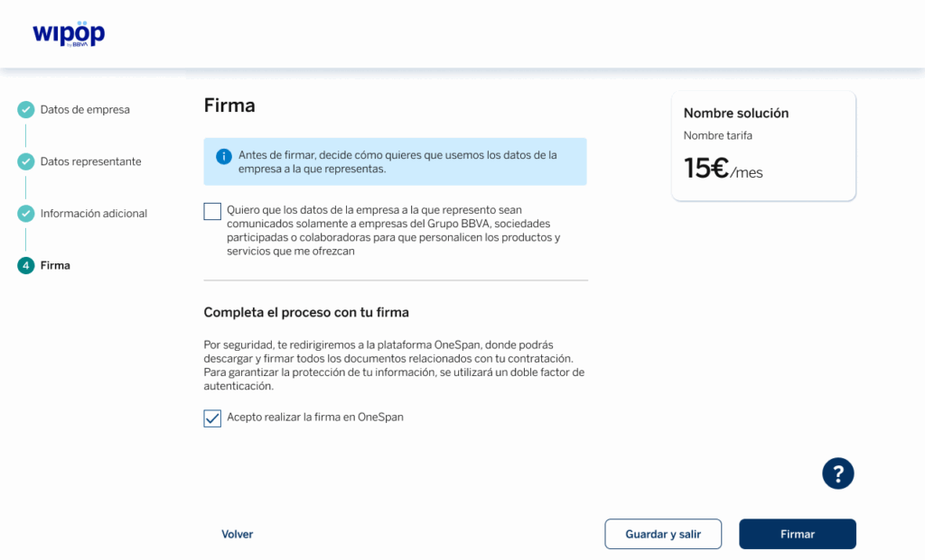 Al final, debes marcar la casilla “Acepto realizar la firma OneSpan” antes de pulsar en “Firmar”. Accederás a nuestra plataforma segura de firma digital OneSpan para finalizar el contrato.