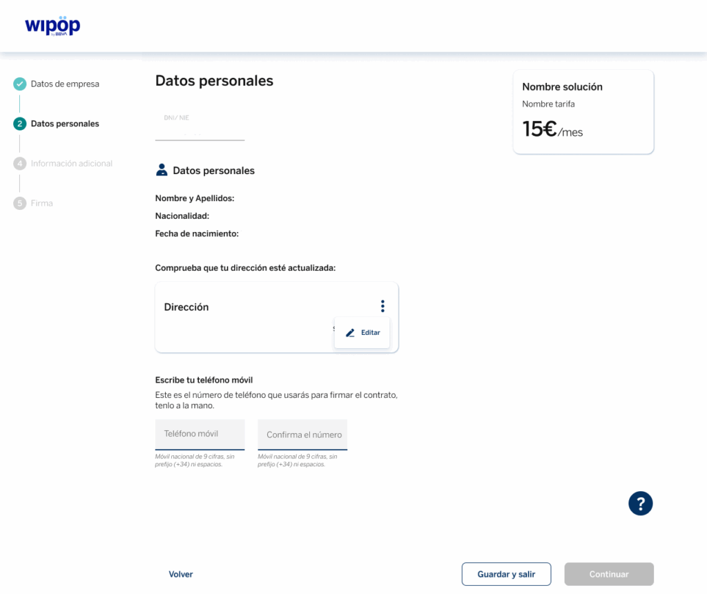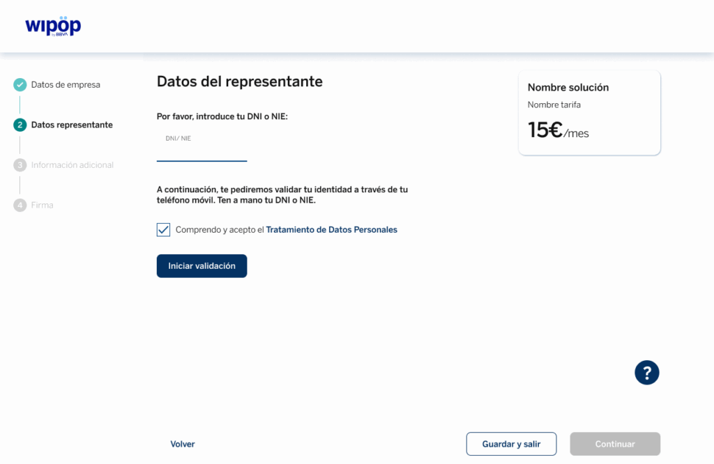 En esta sección, deberás proporcionar la información personal del representante de la empresa, por ello es importante que esta persona tenga a mano el DNI o NIE, así como su teléfono móvil.