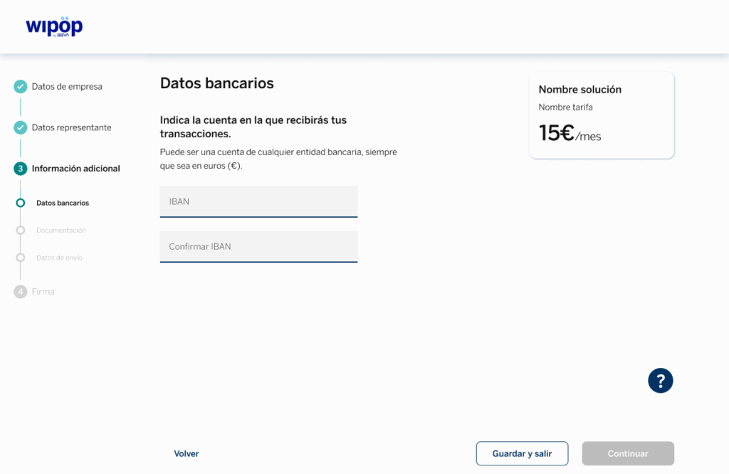 En la primera pestaña de este apartado, se te solicitará introducir el IBAN de la cuenta en la que deseas recibir tus transacciones, tal y como se muestra en el ejemplo a continuación.